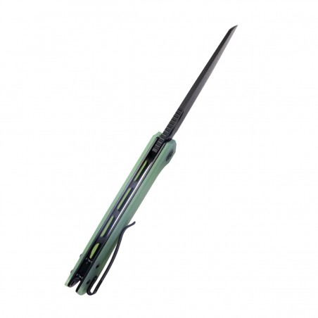 Rękojeść - okładziny z kompozytu G10, praktycznie niezniszczalnego tworzywa, niewrażliwego na warunki atmosferyczne, odpornego na chemikalia i uszkodzenia mechaniczne. Teksturowane dla poprawienia pewności uchwytu, przykręcono do stalowej ramy noża. Otwarta konstrukcja tzw. open-backed bez typowego backspacera, mocowana do siebie stalowymi tulejami dystansowymi ułatwia czyszczenie. Prosta, solidna konstrukcja daje pewność wieloletniego użytkowania. Pivot ozdobiony stylizowanym logo producenta. Dwupozycyjny (prawa/lewa) stalowy klips deep carry pozwala przenosić dyskretnie nóż w kieszeni w pozycji tip-up (czubkiem ostrza do góry). Nad klipsem lanyard hole, otwór do przewleczenia linki.