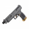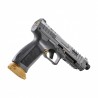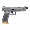 Model w kolorze szarym ze złotymi elementami takimi jak: stopka magazynka i zwalniacz magazynka.