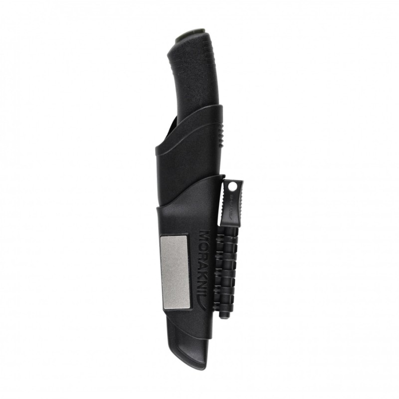 Nóż jest wyposażony w praktyczną pochwę z tworzywa, łatwą w czyszczeniu. Można go nosić na pasku w dwóch różnych konfiguracjach, dzięki ruchomym uchwytom.