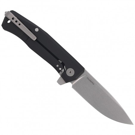 Rękojeść - okładziny w kolorze czarnym z litego aluminium, zamocowano do przekładki dystansowej tzw. backspacera / łącznika okładzin. Tytanowy Solid® klips pozwala przenosić nóż w pozycji tip-up (czubkiem do góry). Klips przykręcono do ramy za pomocą śruby /zbijaka do bicia szkła wykonanej z węglika wolframu. Dołączona jest również płaska śruba jeśli nie chcemy korzystać ze zbijaka. W tylnej części okładzin lanyard hole, otwór na linkę.