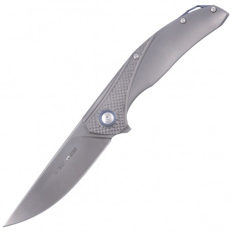 Rękojeść - z litego tytanu GR.5 o pięknym, frezowanym w diamenty wzorze 3D, ukazują możliwości projektowe marki Viper. Solidne okładziny przykręcono do frezowanego za pomocą obrabiarki CNC backspacera z tytanu, co oznacza praktyczną niezniszczalność takiej konstrukcji. Prawostronny, jednopozycyjny tytanowy głęboki klips deep carry, pozwala przenosić dyskretnie nóż w pozycji tip-up (czubkiem ostrza do góry). Backspacer z lanyard hole, podłużnym otworem na linkę asekuracyjną lub ozdobną.