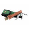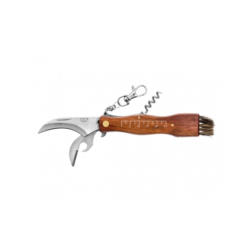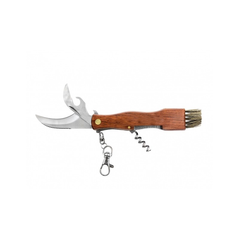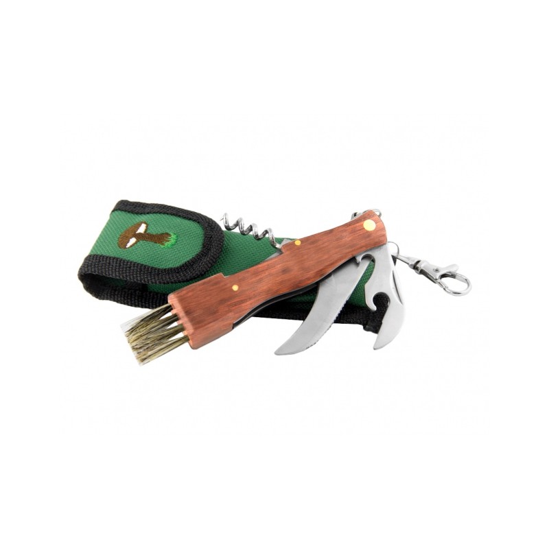 Fabrycznie nowy, wysokiej jakości nóż hiszpańskiej marki JOKER znanej na całym świecie ze swoich doskonałych wyrobów. Jest to składany nóż przeznaczony do zbierania grzybów. Specjalnie zakrzywione ostrze typu Warncliff (ułatwia przycinanie grzybów) wykonane jest z mocnej stali nierdzewnej. Rękojeść wykonana jest z wytrzymałego drewna, na którym znajduje się miarka umożliwiająca zwymiarowanie średnicy grzyba. Na końcu rękojeści znajduje się miotełka umożliwiająca czyszczenie grzybów. Dzięki dołączonemu karabińczykowi można przypiąć go np. do paska. Dodatkowo model ten wyposażony jest w otwieracz do puszek i butelek, pensetę oraz korkociąg. W komplecie pokrowiec z kodury z możliwością przypięcia do pasa. Całość zapakowana jest w ładne tekturowe pudełko co sprawia że nóż idealnie nadaje się na prezent.