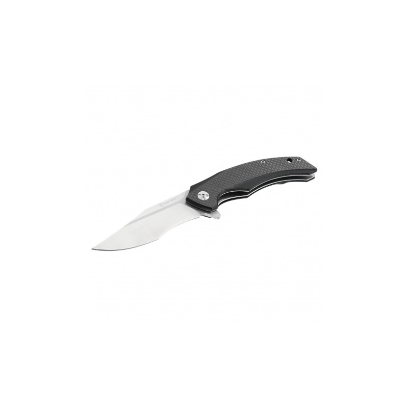 Nóż ma okładziny z laminatu G10 i włókna węglowego, gwarantuje to świetną przyczepność i komfort podczas użytkowania noża. Rękojeść ma profilowany kształt, z konturowanymi ścięciami, co poprawia chwyt noża i wygodę podczas pracy.