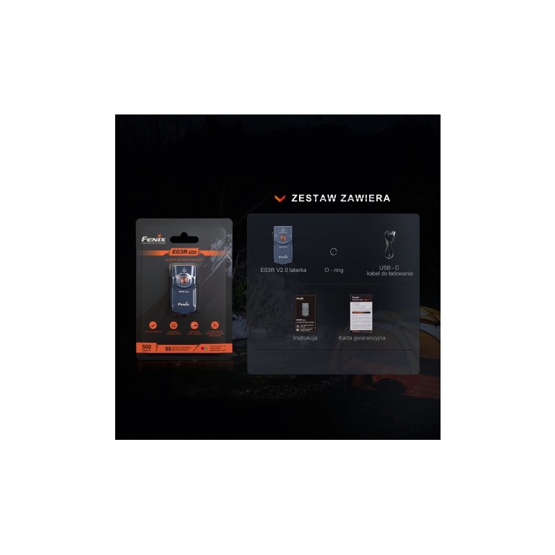Fenix E03R V2.0 to zmodernizowana wersja latarki E03R, która szturmem podbiła rynek kompaktowych latarek do kluczy. Ideą, która przyświecała projektantom nowego modelu, było stworzenie lekkiej, kieszonkowej i jednocześnie wydajnej latarki, która może nam stale towarzyszyć w codziennej aktywności. W ten sposób powstało światełko ważące zaledwie 30 g, wielkości pilota do samochodu, którego maksymalny strumień aż 500 lumenów oświetla przestrzeń na dystansie blisko 90 m. Aby zwiększyć komfort użytkowy i obniżyć jednocześnie koszty użytkowania, latarka ma zintegrowany akumulator, port szybkiego ładowania USB-C oraz przydatny wskaźnik poziomu akumulatora, umożliwiający kontrolę pozostałego zapasu energii.