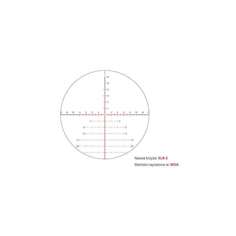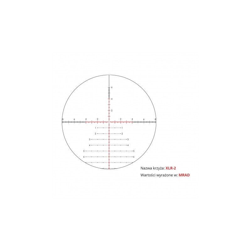 • Krzyż w pierwszym planie — skala krzyża jest proporcjonalna do wielkości przybliżonego celu. Stałe podziałki pozwalają na dokładne namierzenie celu na całym zakresie przybliżenia,