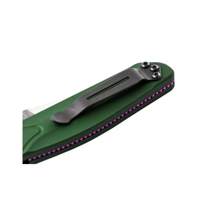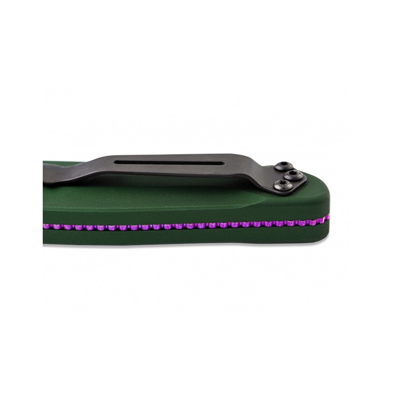 Aluminiowa wkładka z aluminium anodowanego na kolor fioletowy efektownie kontrastuję z ciemną kolorystyką noża i bez wątpienia przyciągają uwagę każdego miłośnika noży.