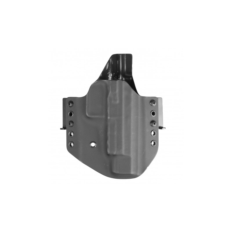 Omawiany model charakteryzuje się konstrukcją typu OWB (Over Waist Band) przeznaczoną do noszenia na zewnętrznej stronie pasa. Kabura tego typu gwarantuje wysoki komfort przenoszenia oraz możliwość szybkiego dobycia. W przypadku chęci wykorzystania w roli kabury EDC konstrukcja skutecznie dociska broń do naszego ciała, pozwalając na dyskretne przenoszenie jej pod obszerną koszulą, marynarką lub kurtką. Kabura OWB doskonale sprawdzi się również w taktycznych lub sportowych konfiguracjach pasa strzeleckiego - skorzystamy z niej zatem zarówno na strzelnicy, jak i w codziennym użytkowaniu. Zwielokrotnione porty montażu szlufek pozwolą nam na ustalenie pionowej pozycji kabury.