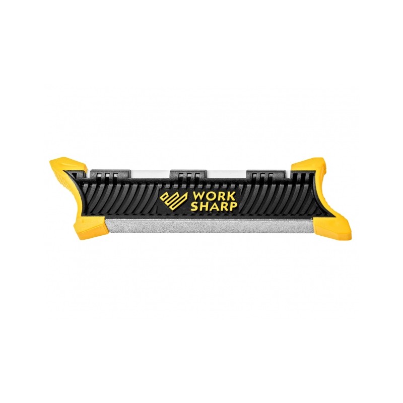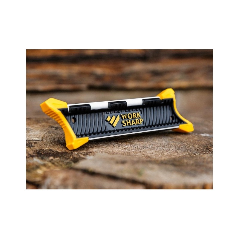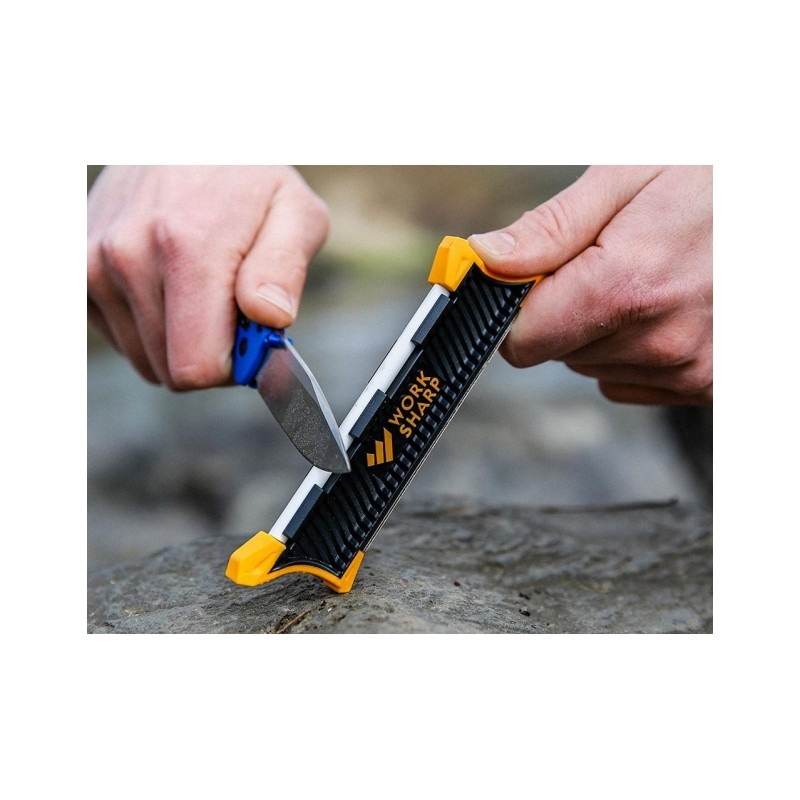 Work Sharp WSGPS to wydajna ostrzałka kieszonkowa, wyposażona w prowadnice o kątach 20° i 25° oraz dwie powierzchnie ostrzące w postaci diamentowej płytki, oraz ceramicznego pręcika.