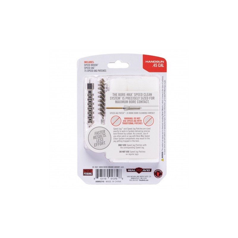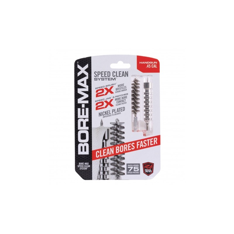 Profesjonalny zestaw czyszczący Real Avid Bore Max Speed Clean Set do .45, pozwala na wydajne i szybkie czyszczenie przewodu lufy pistoletu. W skład zestawu wchodzą gęsta szczotka z włosiem z brązu fosforowego, przecieraki ze specjalnego włókna mikroporowego oraz adapter do przecieraków.