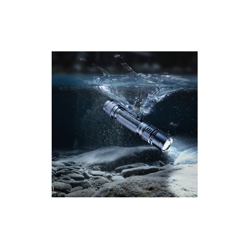 Latarka zasilana jest ogniwem typu 21700 o potężnej pojemności aż 5000 mAh! Zastosowany akumulator ma dwukrotnie większą pojemność niż standardowe ogniwo 18650, co w oczywisty sposób przekłada się na ogromną wydajność i imponujący czas pracy.