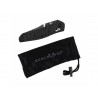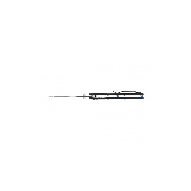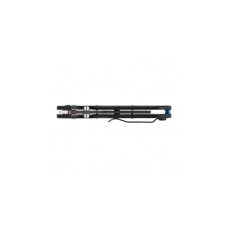 Rękojeść wzmacniają stalowe wkładki oraz tuleje dystansowe anodowane na niebiesko, efektownie kontrastujące z czarną kolorystykę noża. Okładziny uzupełnia sprężysty klips, umożliwiający wygodne przenoszenia noża w kieszeni lub na pasie.