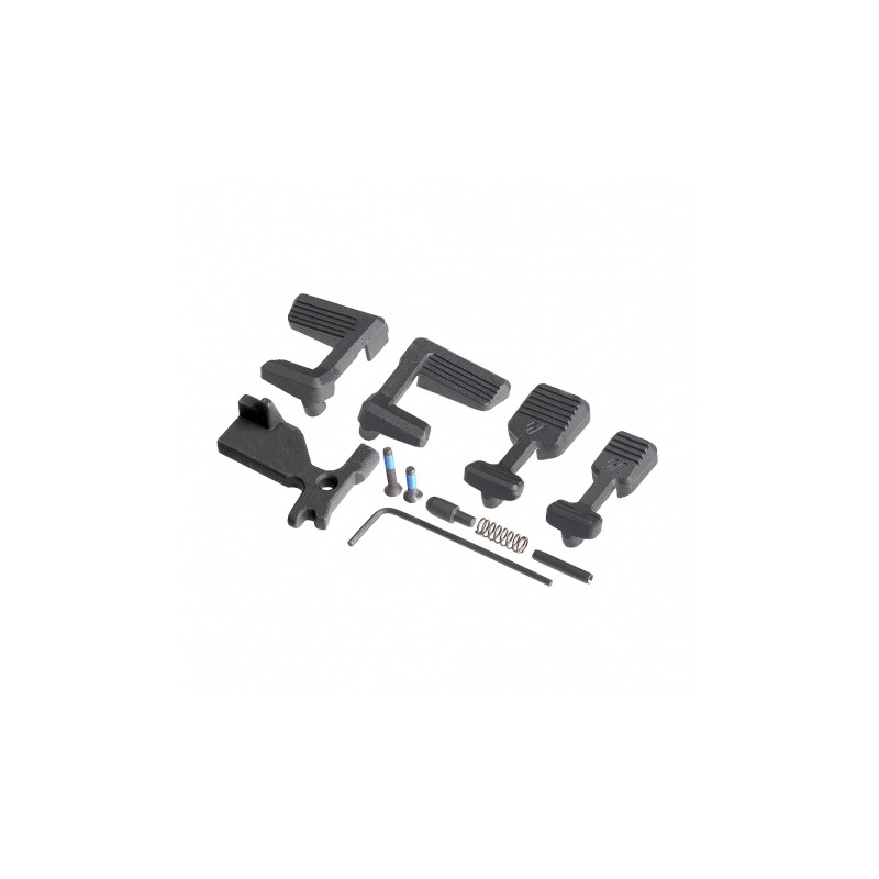 Cechy powiększonych dźwigni zwalniacza suwadła AR Modular Bolt CatchDźwignie wykonane są z wytrzymałego polimeru i idealnie sprawdzą się zarówno dla strzelców sportowych, jak i zawodowych. Zwiększona powierzchnia elementu pozwala na wygodną obsługę zarówno przy pomocy kciuka, jak i całej dłoni. Fakturowanie każdego z czterech przycisków ułatwia manipulowanie nimi. Zestaw zawiera cztery przyciski: jeden o standardowej wielkości, jeden powiększonej wielkości oraz dwa przedłużone (jeden do przodu, drugi do tyłu), dzięki czemu użytkownik może łatwo i szybko dostosować broń do swoich preferencji.