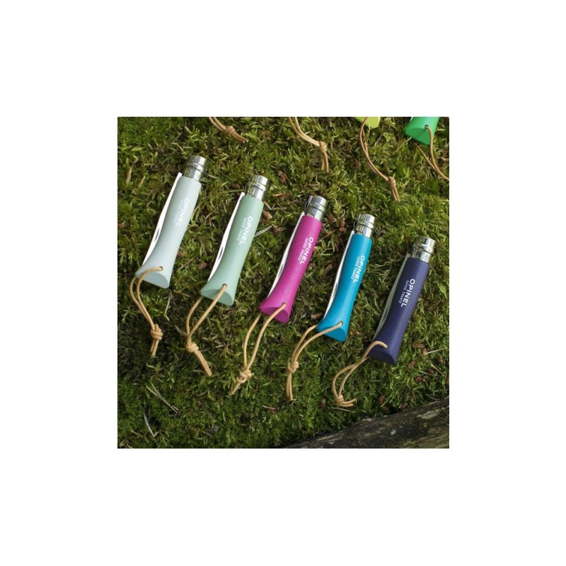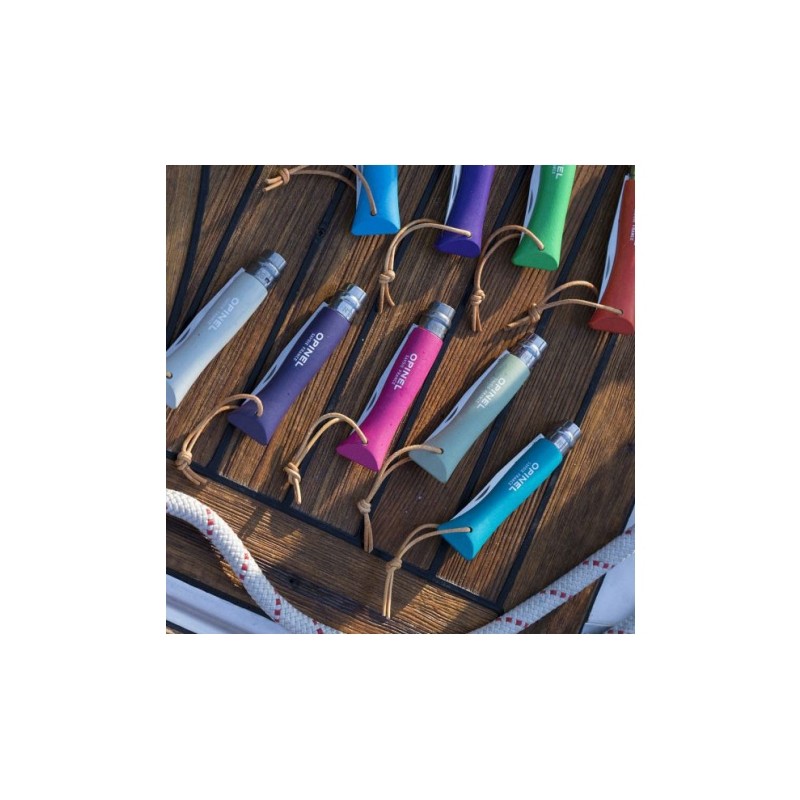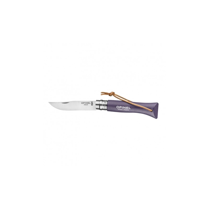 Opinel Colorama 06 inox fioletowy z rzemieniem to składany nóż outdoorowy, wyposażony w ostrze ze stali nierdzewnej Sandvik 12C27M, blokadę Virobloc, oraz drewnianą rękojeść z rzemieniem do mocowania.