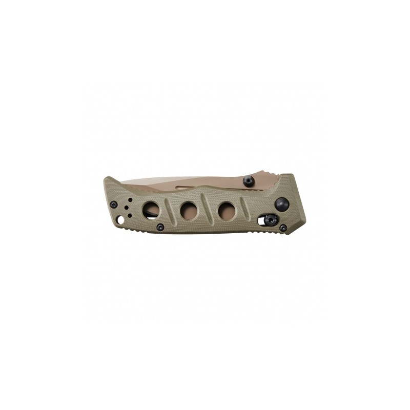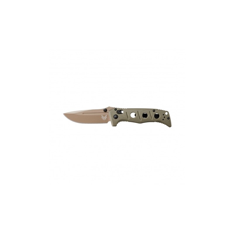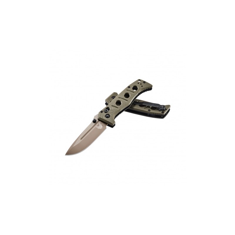 Benchmade 273FE-2 Mini Adamas ma okładziny w kolorystyce olive drab z tworzywa G10 wykonane precyzyjną techniką 3D. Zastosowany laminat szklano-epoksydowy cechuje się niewielką masą, wysoką wytrzymałością mechaniczną, odpornością na wodę, zmianę temperatur, a także działanie wielu kwasów i rozpuszczalników. Konturowany kształt w połączeniu z poprzecznym frezowaniem i szorstką fakturą tworzywa zapewniają doskonałą przyczepność noża oraz komfort użytkowy. Półotwarta konstrukcja rękojeści ułatwia utrzymywanie noża w czystości.