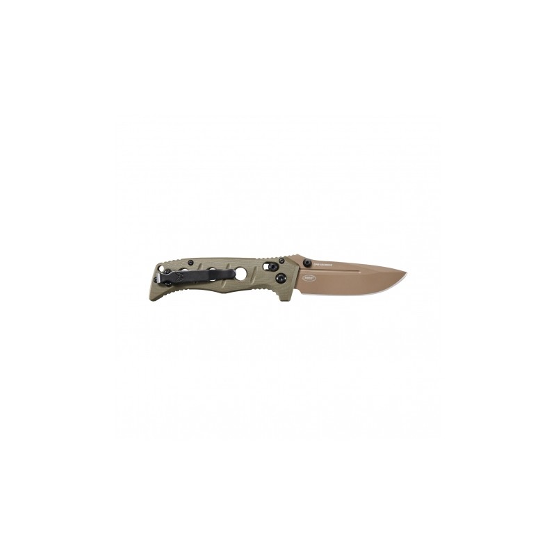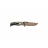 Szeroką klingę drop-point o długości 82 mm, pokryto brązową powłoką cerakote, który chroni przed drobnymi zarysowaniami i podkreśla taktyczny charakter noża. Klinga ma mocny sztych i szlif płaski, co gwarantuje płynne cięcie oraz łatwą penetrację. Głownia w najszerszym miejscu ma aż 3,5 mm grubości.