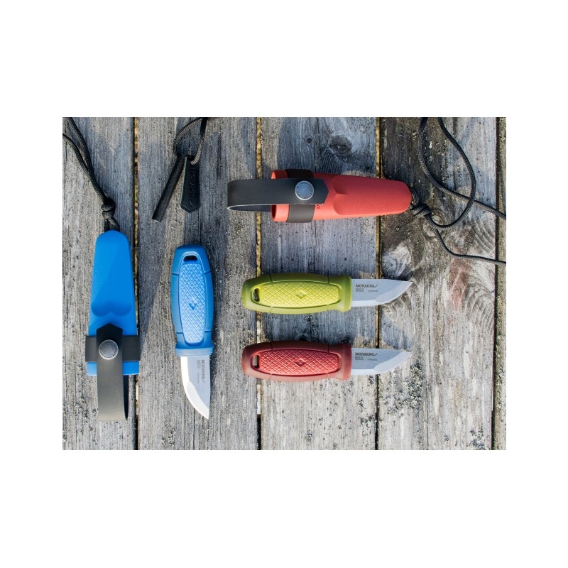 Nóż Mora Eldris jest dostępny w pięciu kolorach (każdy w zestawie z pochwą, która stabilnie trzyma nóż dzięki specjalnej blokadzie)
