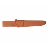 Nóż ma profilowaną rękojeść wykonaną z miękkiej gumy TPE o antypoślizgowej fakturze zwiększającej przyczepność noża. Do przenoszenia Morakniv Companion Heavy Duty na pasie otrzymujemy prostą polimerową pochewkę o otwartej konstrukcji, pozwalającej na szybki dostęp do noża.