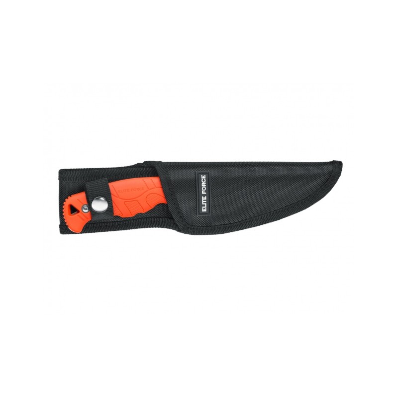 Profilowane okładziny z polimeru mają wycięcia na palce oraz rowkowania, co zapewnia pewny oraz komfortowy chwyt noża. Otwór w rękojeści można wykorzystać do wplecenia linki lub oplotu z paracordu. Nóż można wygodnie przenosić na pasie w nylonowej pochewce, znajdującej się w komplecie. Jaskrawo pomarańczowa kolorystyka rękojeści powoduje, że nóż jest dobrze widoczny niemal na każdym naturalnym podłożu. Do przenoszenia noża przy pasie otrzymujemy nylonową poAchewkę zapinaną na napę.