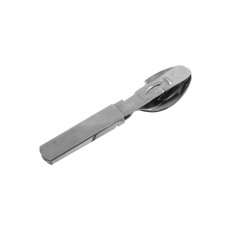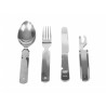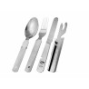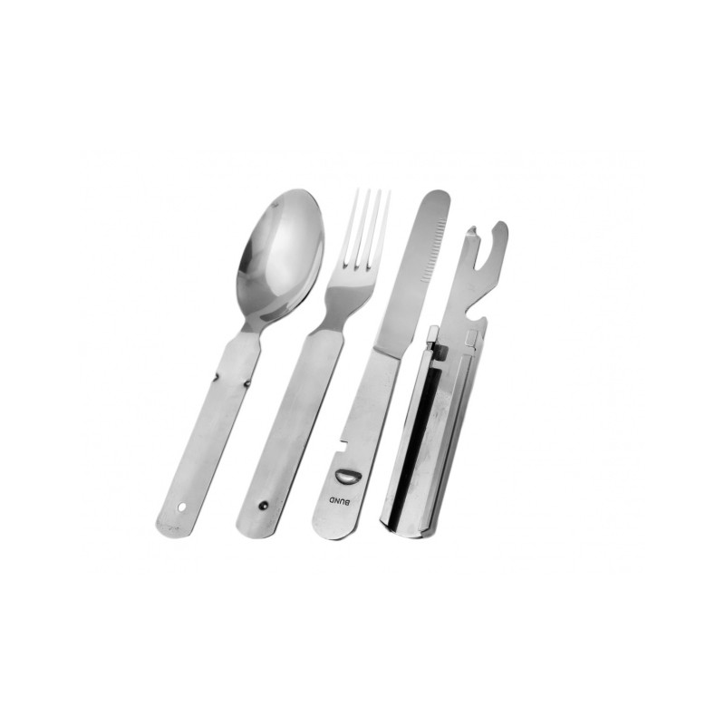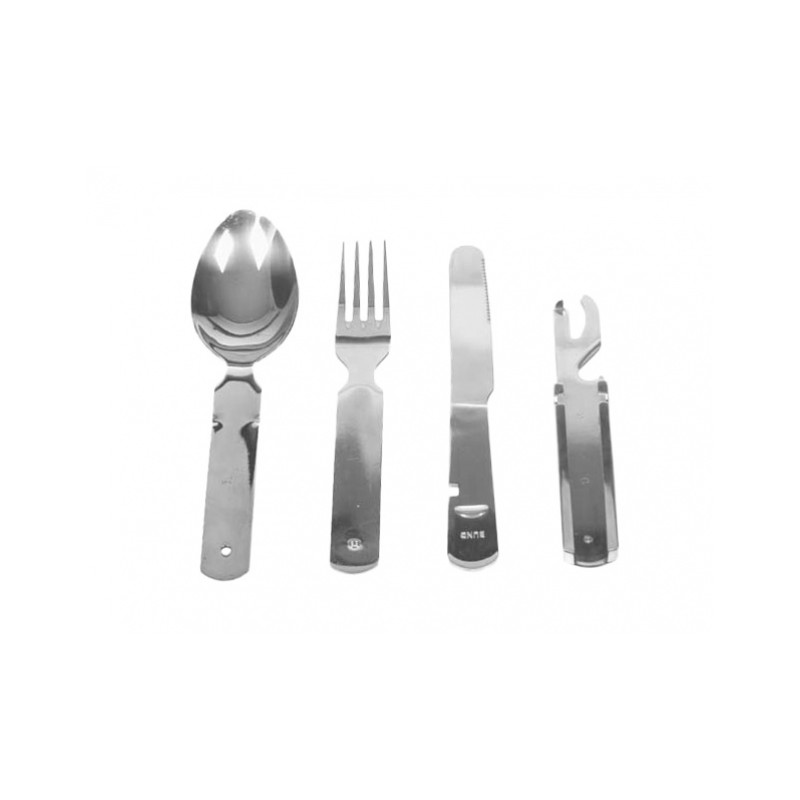 Niezbędnik MFH 4-częściowy został doskonale wykonany z mocnej i grubej stali nierdzewnej dla niemieckiej marki FOX. W zestawie znajduje się: nóż o strukturze piły, widelec, łyżka oraz otwieracz do puszek i butelek o standardowych wymiarach tych narzędzi, zaprojektowany na wzór niezbędników Bundeswehry. Wszystkie elementy można złożyć w taki sposób, jak to zostało uwidocznione na zdjęciu.