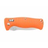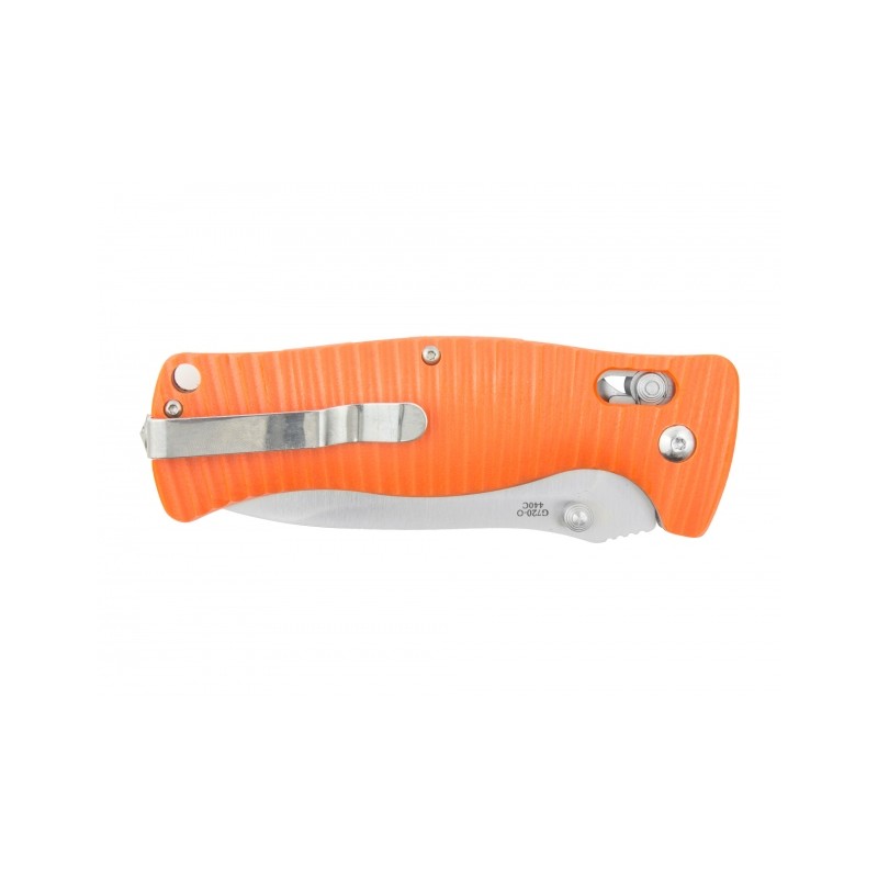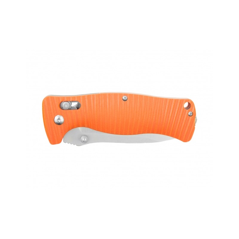 Profilowana i ergonomiczna rękojeść zapewnia pewny chwyt w każdych warunkach. Rękojeść to solidne połączenie stalowych przekładek z mocno teksturowanymi okładzinami wykonanymi z materiału o nazwie G10 w kolorze pomarańczowym. Nóż posiada konstrukcję otwartą, co umożliwia utrzymanie mechnizmów w czystości. Do rękojeści przykręcono stalowy klips, który pozwala na bezpieczne i dyskretne przenoszenie noża. Na końcu rękojeści znajduję sie otwór do przewleczenia linki/paracordu.