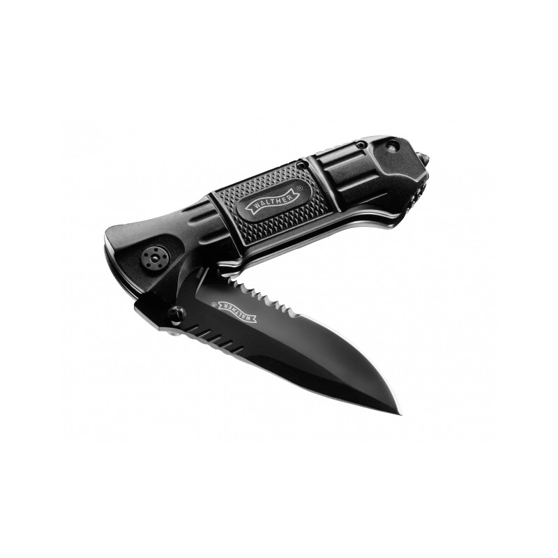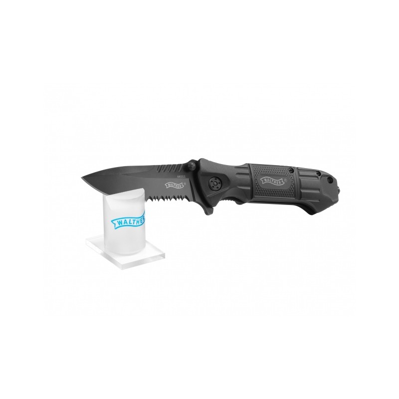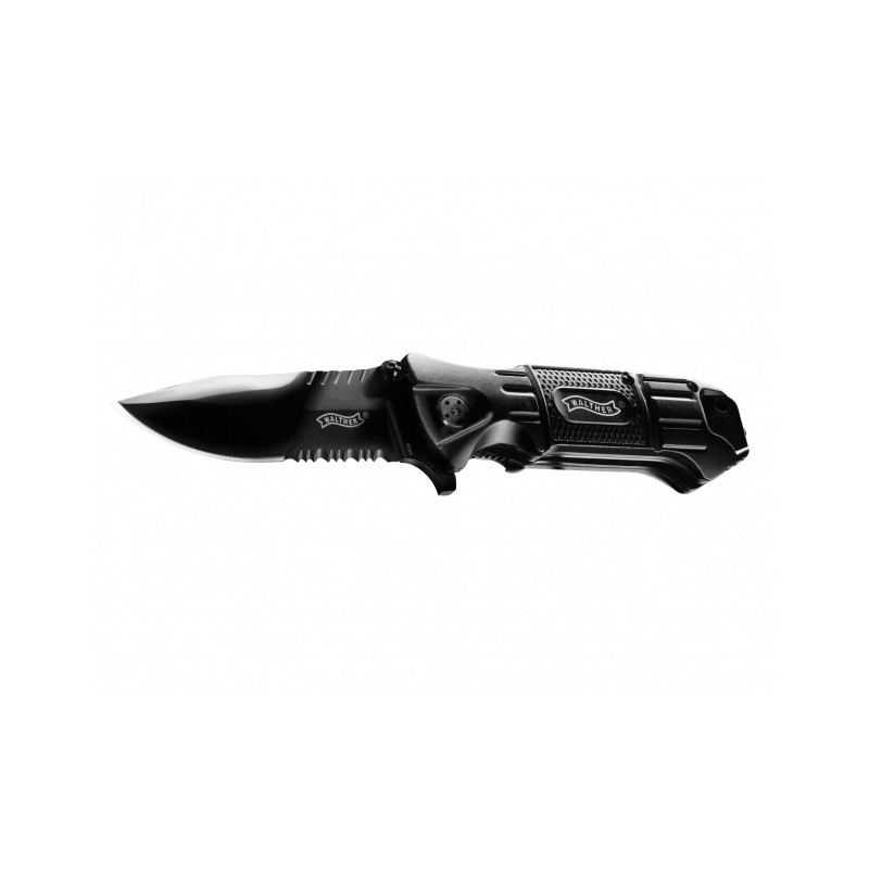 Walther BTK Black Tac to folder w taktycznym stylu, wyposażony w częściowo ząbkowaną głownię ze stali nierdzewnej 440C, blokadę liner-lock oraz awaryjny zbijak do szyb.