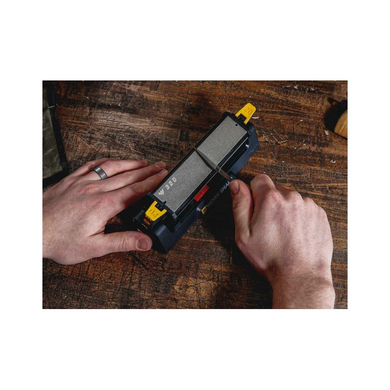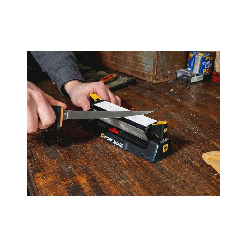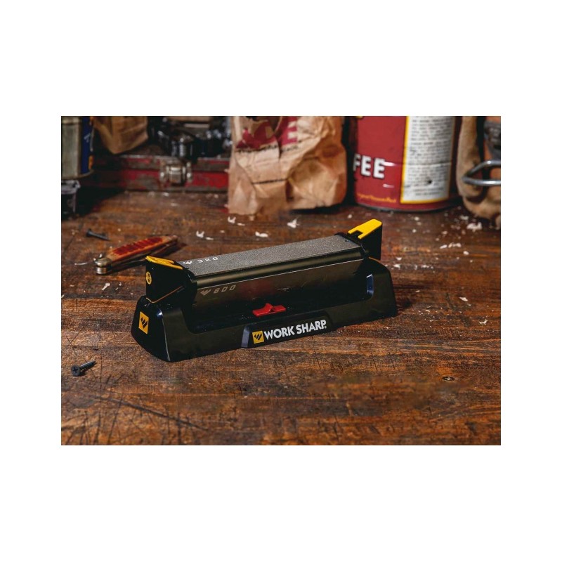 W ostrzałce zastosowano także system autorskie rozwiązanie firmy Work Sharp, gwarantujące pełne ostrzenie od nasady aż po czubek ostrza. Wszystko za sprawą ruchomego bloku ostrzącego, który pod naciskiem noża zmienia kąt i „dopasowuje się” do kształtu ostrza.