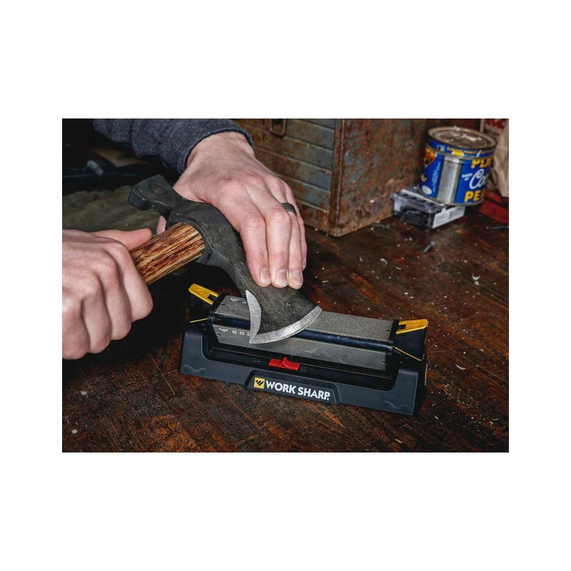 Work Sharp Benchstone to poręczna ostrzałka stołowa, w której zastosowano obrotowy blok z 3 powierzchniami ostrzącymi. Blok osadzono na polimerowej podstawie wyposażonej w antypoślizgowe nóżki oraz wymienne prowadnice kątowe.