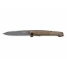 Nóż ma eleganckie okładziny z drewna orzecha włoskiego o matowym wykończeniu. Rękojeść ma profilowany kształt, z wyraźnym wycięciem na palec, co skutecznie poprawia chwyt noża i komfort jego użytkowania.