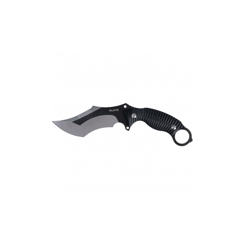 Ruike P181-B czarno-srebrny to nóż taktyczny typu karambit, wyposażony w stałą głownię ze stali nierdzewnej 14C28N, rękojeść z laminatu G10, charakterystyczny stalowy pierścień oraz polimerową pochewkę z klipsem 360°.