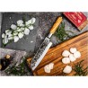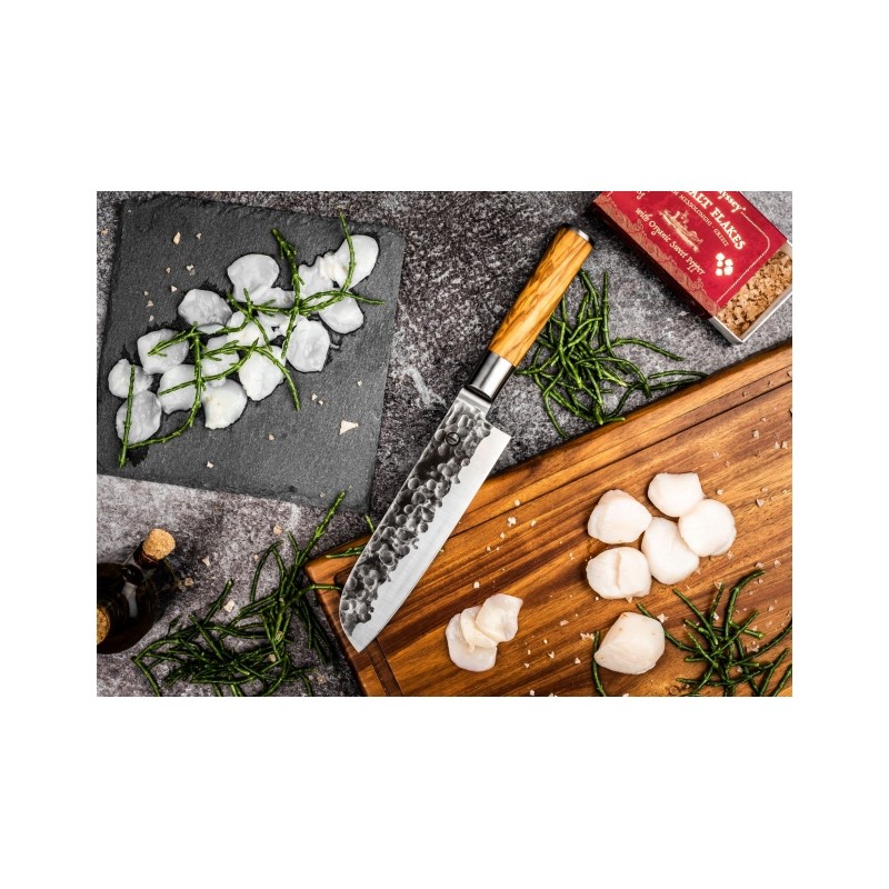 Noże typu Santoku są chętnie wykorzystywane przez szefów kuchni dzięki ich niezwykłej wszechstronności porównywalnej z europejskimi nożami szefa kuchni. Dzięki nieco mniejszym wymiarom pozwalają one na łatwiejsze manewrowanie i ograniczają zmęczenie nadgarstka. Nóż Santoku Forged Olive łączy w sobie wszelkie zalety tej sprawdzonej przez lata formy z doskonałym wyglądem łączącym młotkowaną strukturę głowni z charakterystycznym, wzorzystym drewnem oliwnym.