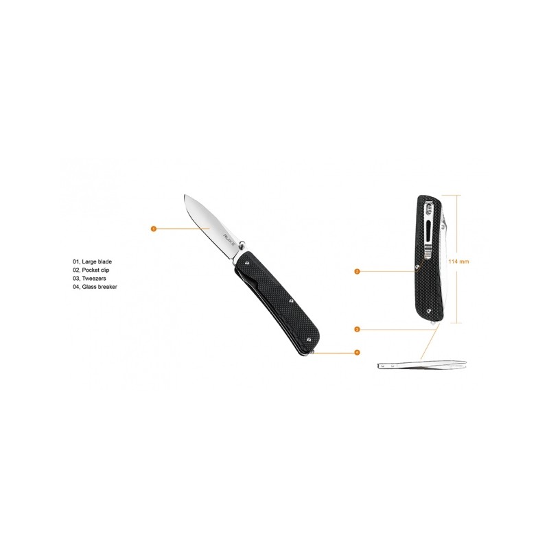 Przedstawiamy Państwu wielofunkcyjny scyzoryk RUIKE LD11-B. Ten wielofunkcyjny scyzoryk został wykonany ze stali nierdzewnej Sandvik 12C27, dzięki czemu mamy pewność, ze scyzoryk długo będzie trzymał ostrość. Okładziny noża zostały wykonane z G10, teksturowania powierzchnia gwarantuje użytkownikowi pewnych chwyt, nawet w mokrych lub wilgotncyh rękach. Za bezpieczeństwo użytkowania odpowiada pewna blokada ostrza liner-lock. Dzięki jednostronnemu klipsowi, nóż możemy przypiąć zarówno do paska, jak i do krawędzi kieszeni. Scyzoryk został wyposażony na końcu rękojeści w zbijak do szyb, dzięki czemu może służyć jako narzędzie ratownicze. Producent w rękojeści noża umieścił również pincetę.