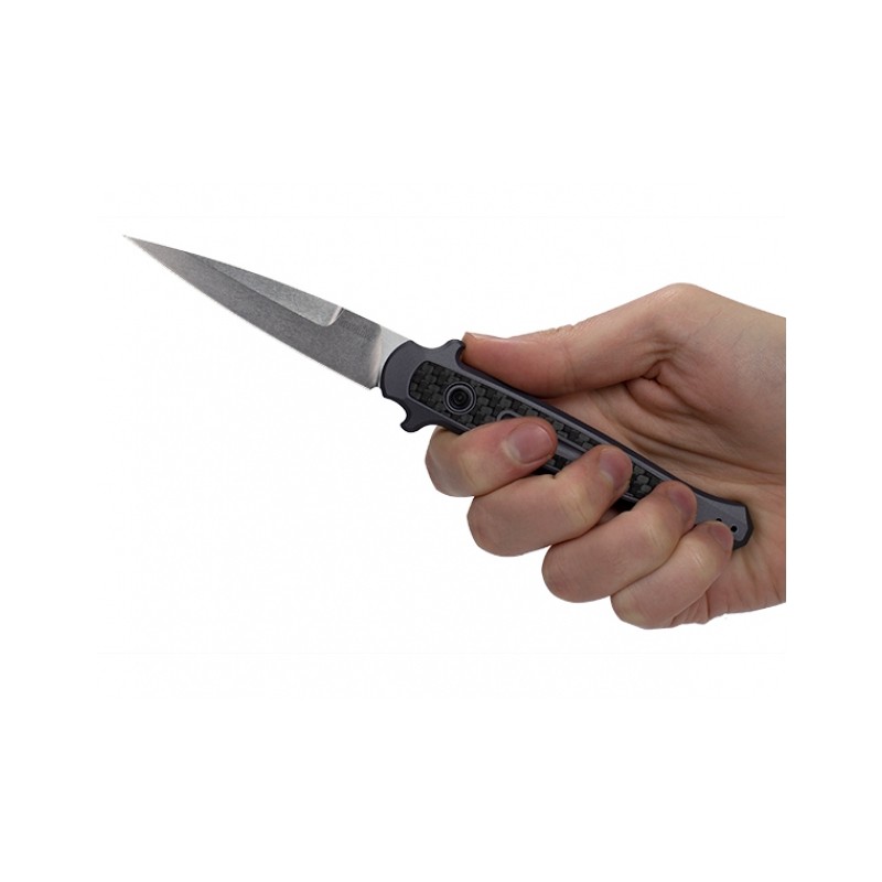 Nóż ma opływowe okładziny z anodowanego aluminium lotniczego 6061-T6, wyposażone w obustronny jelec. Elementem, który nadaje nożowi eleganckiego stylu, jest ozdobna wkładka z włókna węglowego o mieniącej się fakturze.