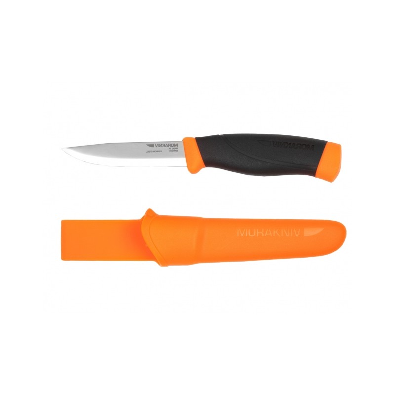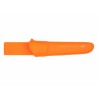 Pomarańczowa pochwa z tworzywa sztucznego utrzymuje i chroni nóż pewnie w czasie jego troczenia na pasie.
