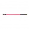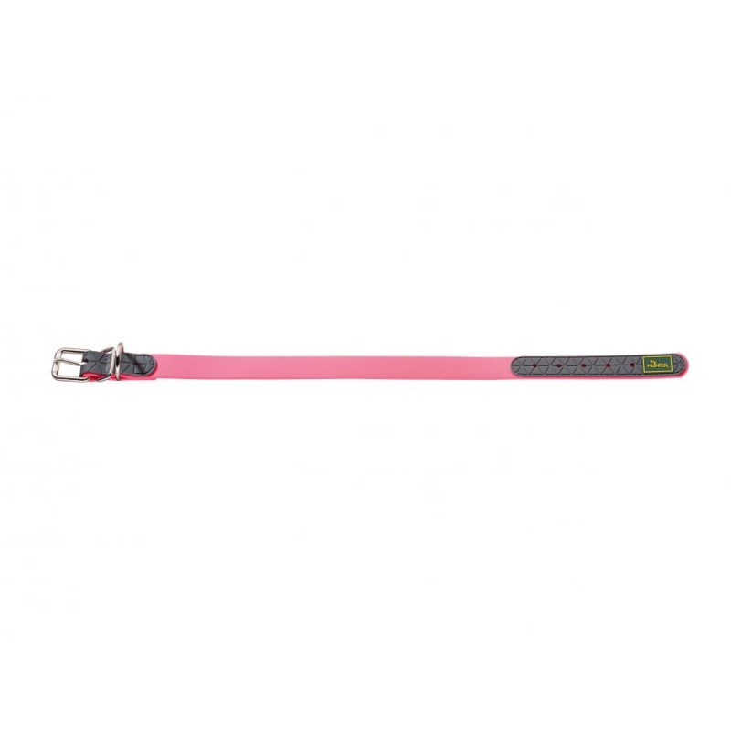 Wyrazista kolorystyka powoduje, że pies jest widoczny z dużej odległości, co jest bardzo istotne podczas pracy w terenie. Obroża ma stalowy pierścień do wpinania smyczy oraz dużą i wygodną do zapinania klamrę.