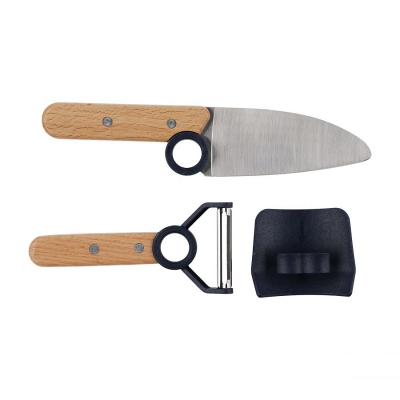 Głównym elementem zestawu jest bezpieczny nóż szefa kuchni, który został wyposażony w zmodyfikowaną głownię o zaokrąglonym sztychu. Dzięki temu idealnie nadaje się do nauki krojenia dla najmłodszych kucharzy. Bezpieczna konstrukcja noża zapewnia ochronę i minimalizuje ryzyko przypadkowego skaleczenia. Opinel Le Petit Chef został wykonany z wysokiej jakości stali nierdzewnej, co gwarantuje nie tylko trwałość, ale także łatwość czyszczenia i ostrzenia.