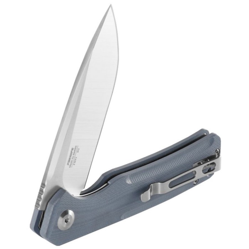 G10 jest łatwy do pielęgnacji, a dzięki lekko szorstkiej fakturze, nawet mokry nóż nie wyślizguje się z ręki podczas użytkowania. Profilowany kształt chwytu, podcięcie na palce oraz przewężenie górnej części chwytu sprawiają, że nóż pewnie leży w dłoni, a jego użytkowanie jest wygodne. Dyskretne przenoszenie noża w kieszeni umożliwia wysoko osadzony klips z możliwością montażu po obu stronach rękojeści.