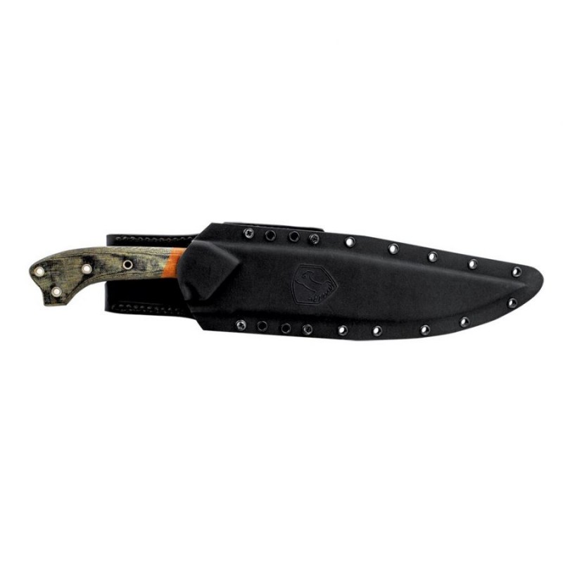 Do noża dołączono kydexową pochwę – mocną i praktyczną. Posiada skórzaną szlufkę, pozwalającą zawiesić nóż na pasie. Pochewka jest również kompatybilna z systemem montażowym MOLLE.