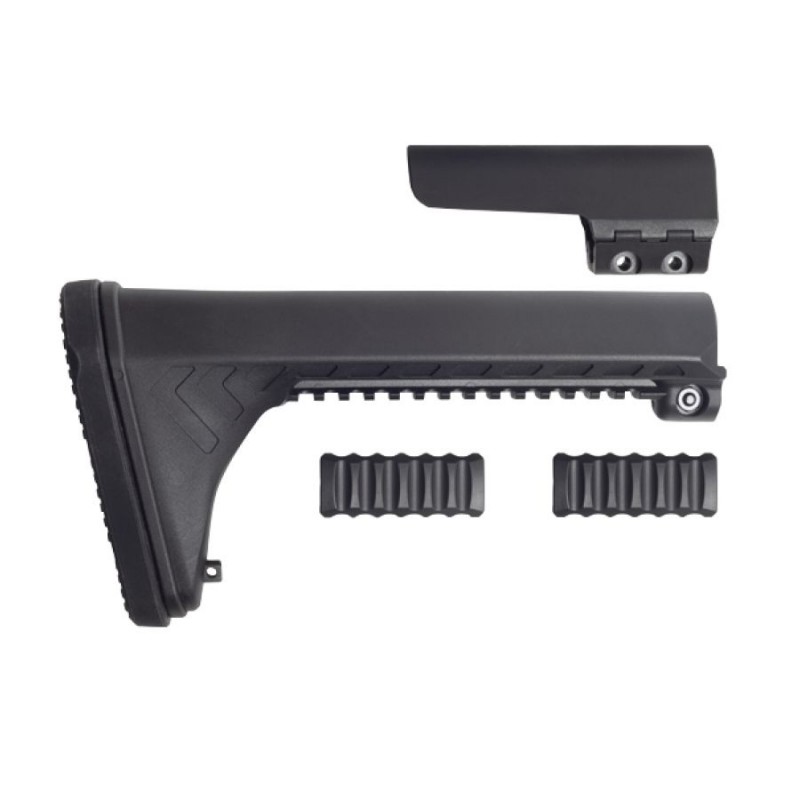 Komfort użytkowania zapewniają agresywnie teksturowana stopka (z metalową wkładką) zmniejszająca odczuwanie odrzutu oraz symetrycznie ścięte boki, które ułatwiają stabilne i wygodne złożenie do strzału osobom prawo i leworęcznym. W dolnej części kolby znajduje się szyna Picatinny umożliwiająca mocowanie baki policzkowej w wybranej przez nas pozycji. Jeśli nie korzystamy z baki policzkowej, szynę można w zakryć za pomocą dwóch paneli ochronnych (w zestawie).