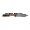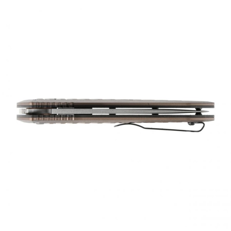 Okładziny z anodowanego aluminium 6061-T6 mają profilowany kształt, który rozszerza się u nasady głowni, tworząc w ten sposób naturalny jelec. Zapobiega to zsuwaniu się dłoni na ostrze oraz zapewnia punkt oparcia dla palców. Skośne frezy podkreślają taktyczny charakter, oraz zapewniają pewny chwyt noża zarówno gołą ręką, jak i w rękawiczce. Dyskretne przenoszenie noża w kieszeni umożliwia wysoko mocowany klips z możliwością przełożenia na drugą stronę.