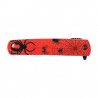 Przed przypadkowym złożeniem głowni skutecznie chroni klasyczna blokada liner-lock, ceniona za wytrzymałość oraz łatwość obsługi. Mechanizm składa się ze sprężynującej listwy, która blokuje klingę, opierając się o jej tylną część. Nóż Ganzo G626-RD ma proste okładziny z tworzywa sztucznego, na których naniesiono ozdobną grafikę z motywem pająków. Dyskretne przenoszenie noża w kieszeni ułatwia stalowy klips deep carry (tip down, bez możliwości przełożenia).
