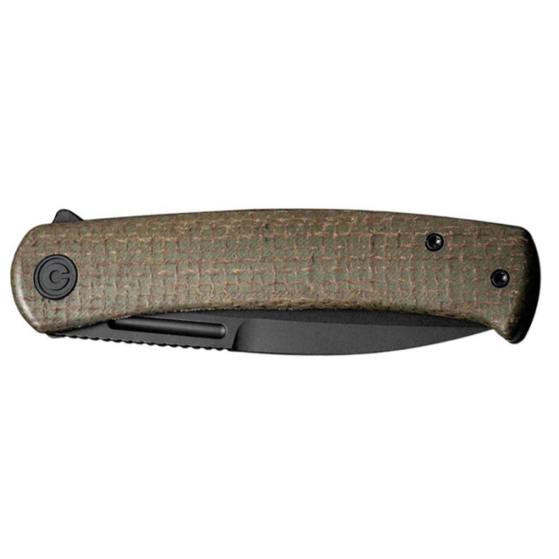 Rękojeść w składanym nożu na stronie prezentacyjnej wykonana została z Micarty w kolorze zielonym, płótna prasowanego pod ciśnieniem z żywicą, zaś od strony blokady ze stali nierdzewnej.
