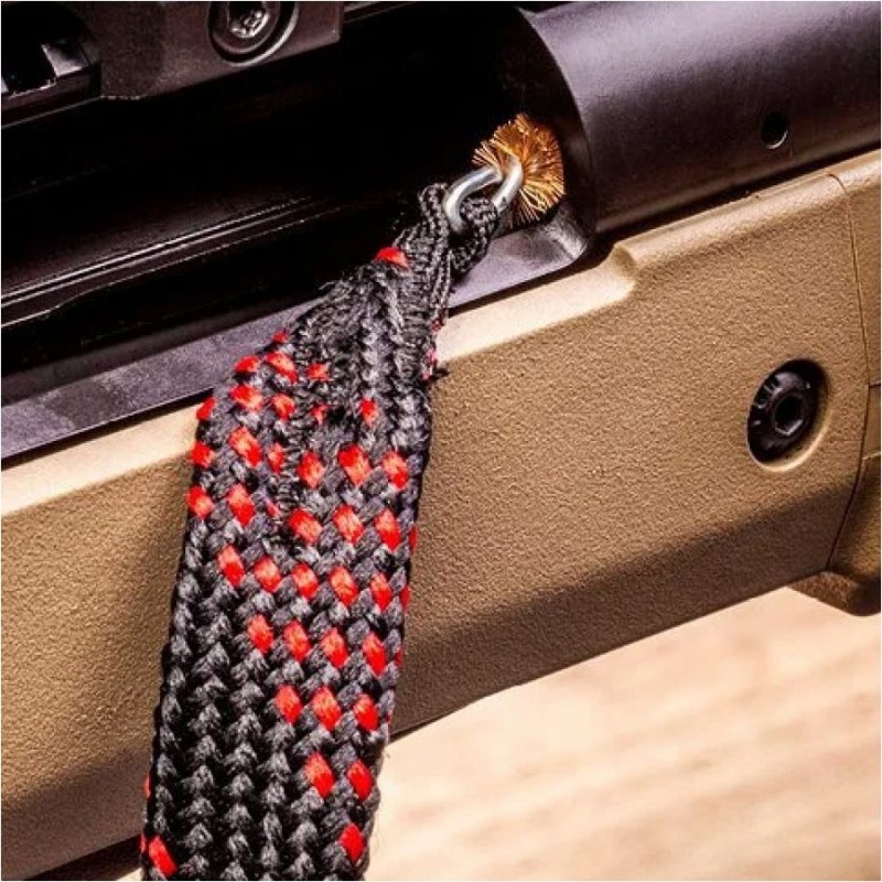Dołączony w zestawie sznur do czyszczenia lufy Bore Boss wyróżnia się na tle konkurencji niezwykle przemyślanym pojemnikiem, który pozwala na przechowywanie ubrudzonego sznura bez ryzyka zanieczyszczenia otoczenia. Co więcej, element ten służy również jako chwyt, pozwalając na wygodne przeciągnięcie sznura przez lufę. Dzięki połączeniu miedzianej szczotki z plecionym, nylonowym mopem, Bore Boss skutecznie zbiera pozostałości z gwintu, jednocześnie rozprowadzając preparat konserwujący równomiernie po jego powierzchni.