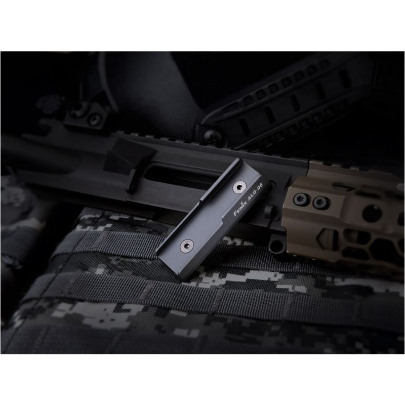Korpus montażu wykonano ze stopu aluminium A6067-T6, o matowym anodyzowanym wykończeniu typu HA-III. Fenix ALG-05 dedykowany jest do włączników żelowych: AER-02 V2.0, AER-03 V2.0, AER-04 i AER-05 ALG-06 montowany jest na łożu M-LOK za pomocą dwóch śrub oraz samokontrujących nakrętek T-nuts, które zapobiegają przesuwaniu uchwytu pod wpływem odrzutu broni. Przycisk włącznika po wsunięciu do objemy ALG-06 blokują 2 szerokie występy.
