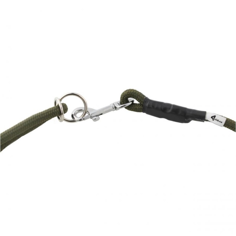 Smycz przepinaną 4wild wykonano z mocnej linki polipropylenowej o grubości 10 mm. Syntetyczna linka jest lekka, trudna do zerwania i co istotne w przypadku aktywnego psa — łatwa do czyszczenia. Smycz można czyścić pod bieżącą wodą przy użyciu domowych środków czyszczących i szczoteczki.