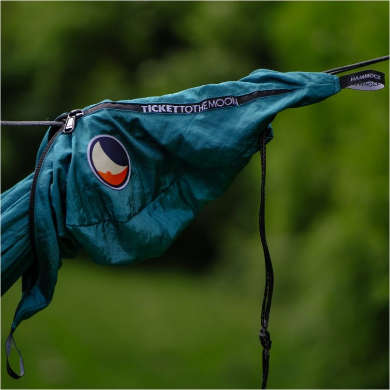 Jednoosobowy hamak Ticket To The Moon jest lekki i kompaktowy o wymiarach 320 × 155 cm wykonano z przewiewnego, szybkoschnącego nylonu spadochronowego. Materiał spełnia standardy ekologiczne Oeko-Tex Standard 100. Materiał jest hipoalergiczny, zapobiega podrażnieniom skóry i charakteryzuje się elastycznością, co zapewnia komfort i dobre dopasowanie. Wykazuje również odporność na rozerwania, zabrudzenia i pleśń oraz zapewnia odpowiednią wentylację.