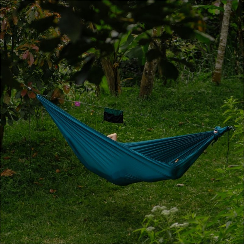 Złożony hamak zajmuje bardzo mało miejsca. Jest również lekki – waży tylko 500 g. Dodatkową funkcjonalność zapewnia boczna kieszeń na drobne przedmioty.