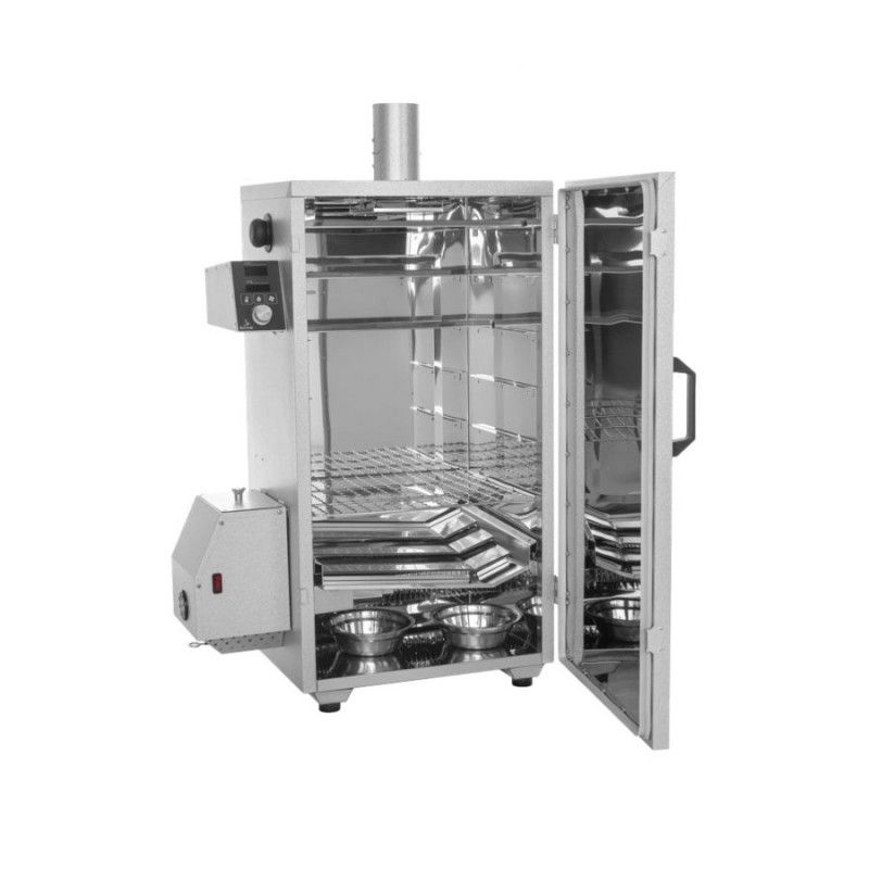 Uszczelniane drzwi mają wygodne zamykanie magnetyczne. Korpus zewnętrzny wędzarni wykonano z blachy alu-cynk, którą cechuje wysoką odporność na działanie warunków atmosferycznych. Dzięki temu naszą wędzarnię możemy zostawić na zewnątrz bez obaw o powstanie gniazd korozji. Wnętrze komory wyłożone jest atestowaną stalą nierdzewną bezpieczną dla zdrowia i dopuszczoną do kontaktu z żywnością. W tym modelu dodatkowo zastosowano timer, który pozwala na ustawienia czasu pracy grzałki oraz oddzielnie czasu pracy generatora dymu i trybu osuszania.