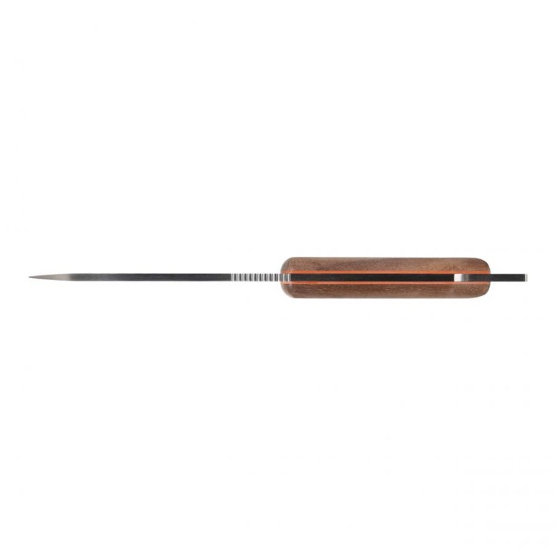 Okładziny rękojeści wykonano z drewna orzechowego i tworzywa G10 – kompozytu z włókna szklanego i syntetycznej żywicy, lekkiego i niepodatnego na uszkodzenia mechaniczne. Wygładzone krawędzie okładzin poprawiają pewność uchwytu i sprawiają, że nóż dobrze leży w dłoni.