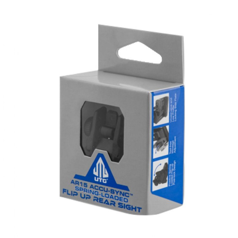 Szczerbinka Leapers UTG Accu-Sync Spring-loaded AR15 to składany przeziernik do karabinków AR15, w pełni kompatybilny z fabryczną muszką oraz kolimatorami.