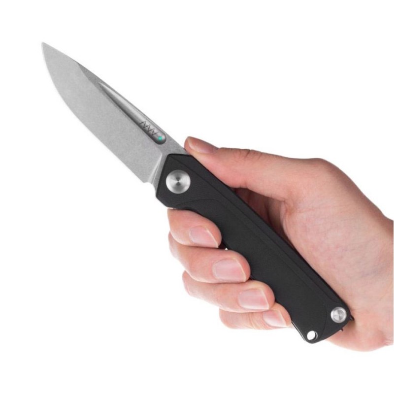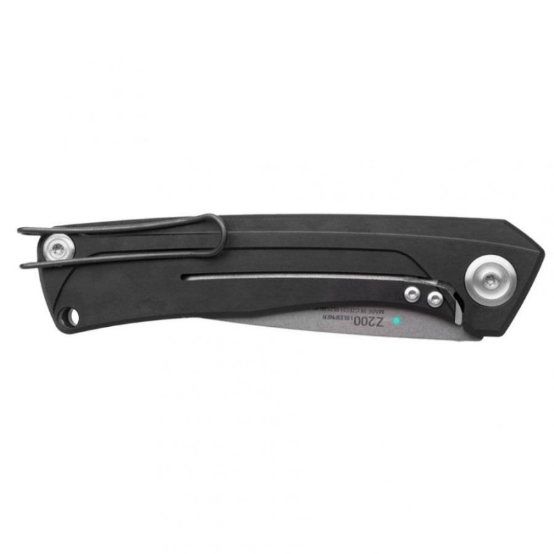 Nóż typu folder został wyposażony w ostrze ze stali narzędziowej Sleipner o hartowaniu 60 HRC, które zostało pokryte czarną powłoką ochronną DLC (Diamond Like Carbon). Sleipner to stal D2 nowej generacji o ulepszonej twardości, ciągliwości i lepszym zachowaniu krawędzi. Należy pamiętać, że Sleipner nie jest stalą nierdzewną, dlatego wymaga odpowiedniej konserwacji.